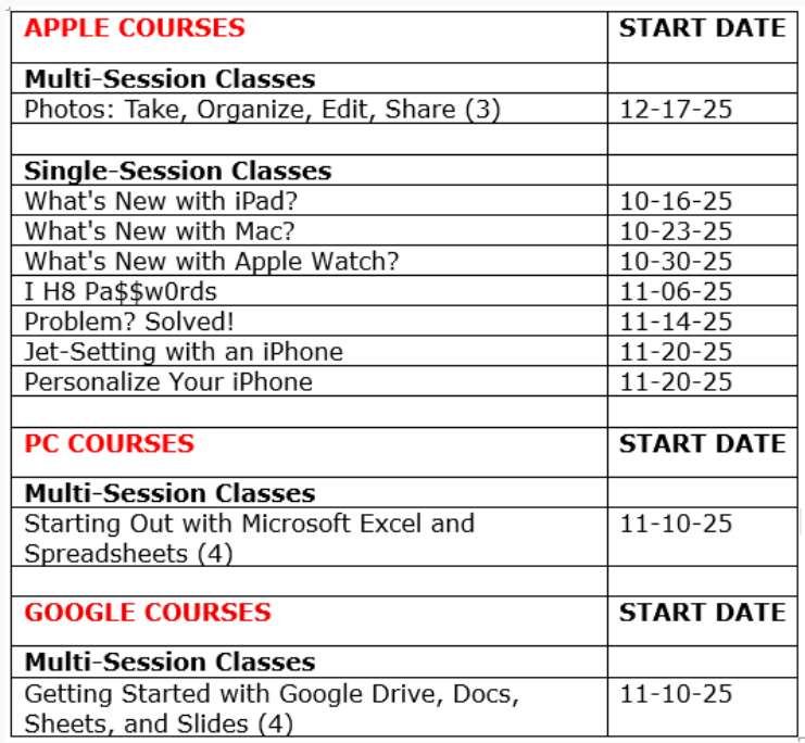 Classes for Users of Apple Products (Macs, iPhones, iPads, Apple Watch and more!) and Windows PCs